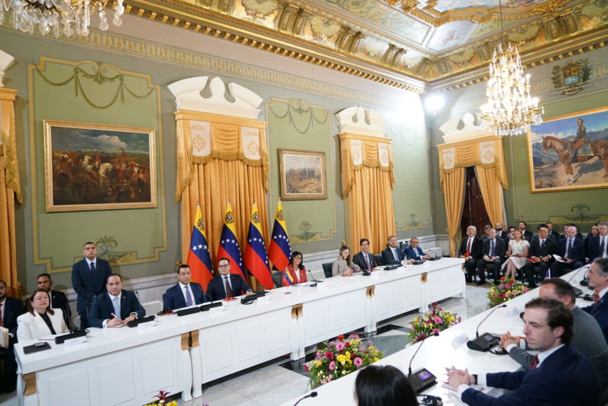 En ese momento Delcy Rodríguez, vestida de rojo vibrante que parecía dejar clara su posición política, encabezaba la escena. A un lado, los invitados estadounidenses, con un Doug Burgum de sonrisa perenne y una corbata también roja, aunque por el color del Partido Republicano de Donald Trump. Junto a él estaba la embajadora Dogu, personal diplomático y empresarios estadounidenses. Al otro lado, en contraste, la comitiva del gobierno venezolano con figuras clave para el gobierno de Rodríguez, como el presidente de la estatal Petróleos de Venezuela S.A. (PDVSA), Héctor Obregón; el vicepresidente sectorial para el Área Económica, Calixto Ortega Sánchez; y el ministro de Interior, Justicia y Paz, Diosdado Cabello.