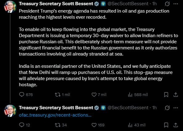 «Esta medida provisional aliviará la presión causada por el intento de Irán de tomar como rehén la energía global», concluyó Bessent.