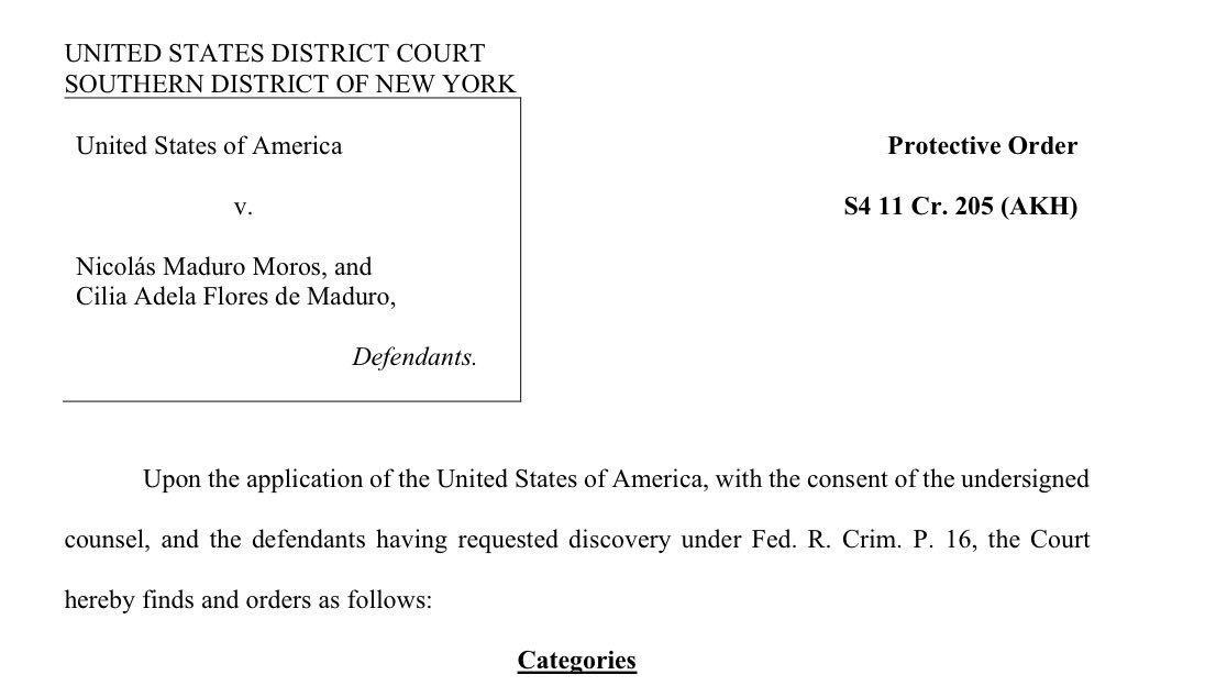 La Fiscalía de Estados Unidos solicitó al juez federal Alvin Hellerstein una orden de protección de documentos en el juicio contra Nicolás Maduro y Cilia Flores para evitar que los coacusados prófugos accedan a las pruebas e identifiquen a los testigos del caso.