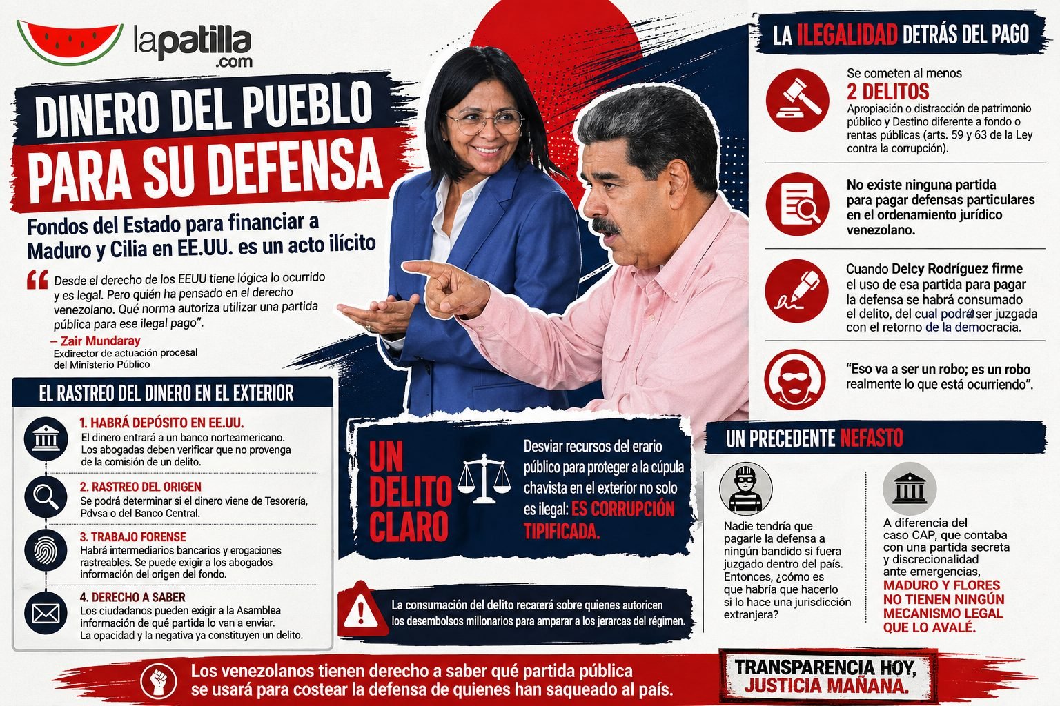A través de un extenso análisis, el abogado penalista cuestionó la viabilidad jurídica de desviar recursos del erario público para proteger a la cúpula chavista frente a la justicia internacional. “Desde el derecho de los EEUU tiene lógica lo ocurrido y es legal. Pero quién ha pensado en el derecho venezolano. Qué norma autoriza utilizar una partida pública para ese ilegal pago”, sentenció Mundaray al exponer la flagrante violación de las leyes nacionales.