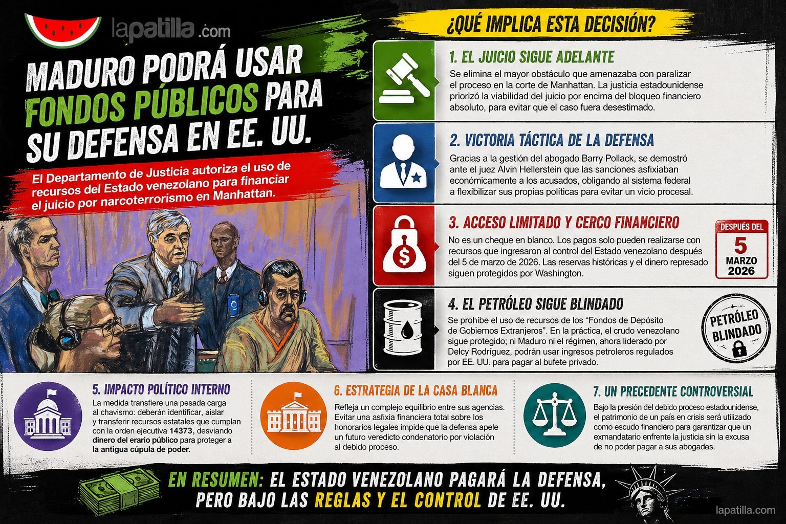 En el plano jurídico, esta decisión implica la eliminación del mayor obstáculo que amenazaba con paralizar el histórico proceso en la corte de Manhattan. Que Maduro acceda a las arcas de la nación significa que la justicia estadounidense priorizó la viabilidad del juicio por encima del bloqueo financiero absoluto, cediendo ante el riesgo de que el caso fuera desestimado por violar el derecho constitucional a la defensa.