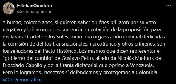 “Y bueno, colombianos, si quieren saber quiénes brillaron por su voto negativo y brillaron por su ausencia en la votación de la proposición para declarar al Cartel de los Soles como una organización criminal dedicada a la comisión de delitos transnacionales, narcotráfico y otros crímenes, son los senadores del Pacto Histórico”, escribió.